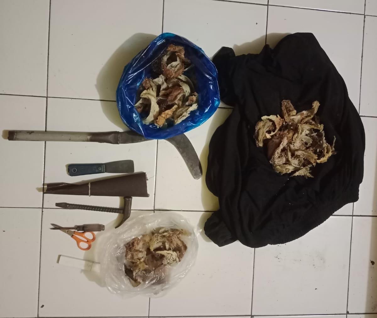 Ketika dilakukan pemeriksaan, petugas menemukan dua kantong plastik berisi sarang burung, satu jaket hitam, satu sabit, satu palu, serta satu senter yang diduga digunakan untuk melakukan aksi pencurian.