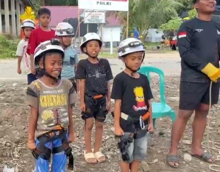 Dalam pelaksanaannya, personel Brimob memanfaatkan peralatan SAR (Search and Rescue) untuk menghadirkan wahana “flying fox mini” yang digunakan sebagai sarana bermain sekaligus terapi pemulihan psikologis bagi anak-anak.