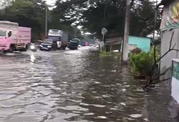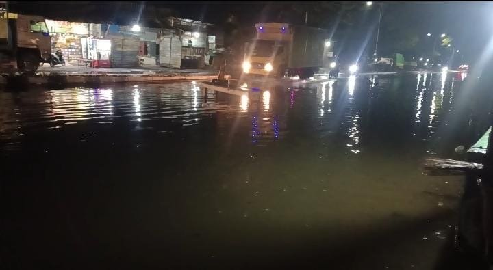 Berdasarkan pantauan di lokasi, air menutup hampir seluruh badan jalan hingga kendaraan, baik truk maupun sepeda motor, harus melintas secara perlahan.