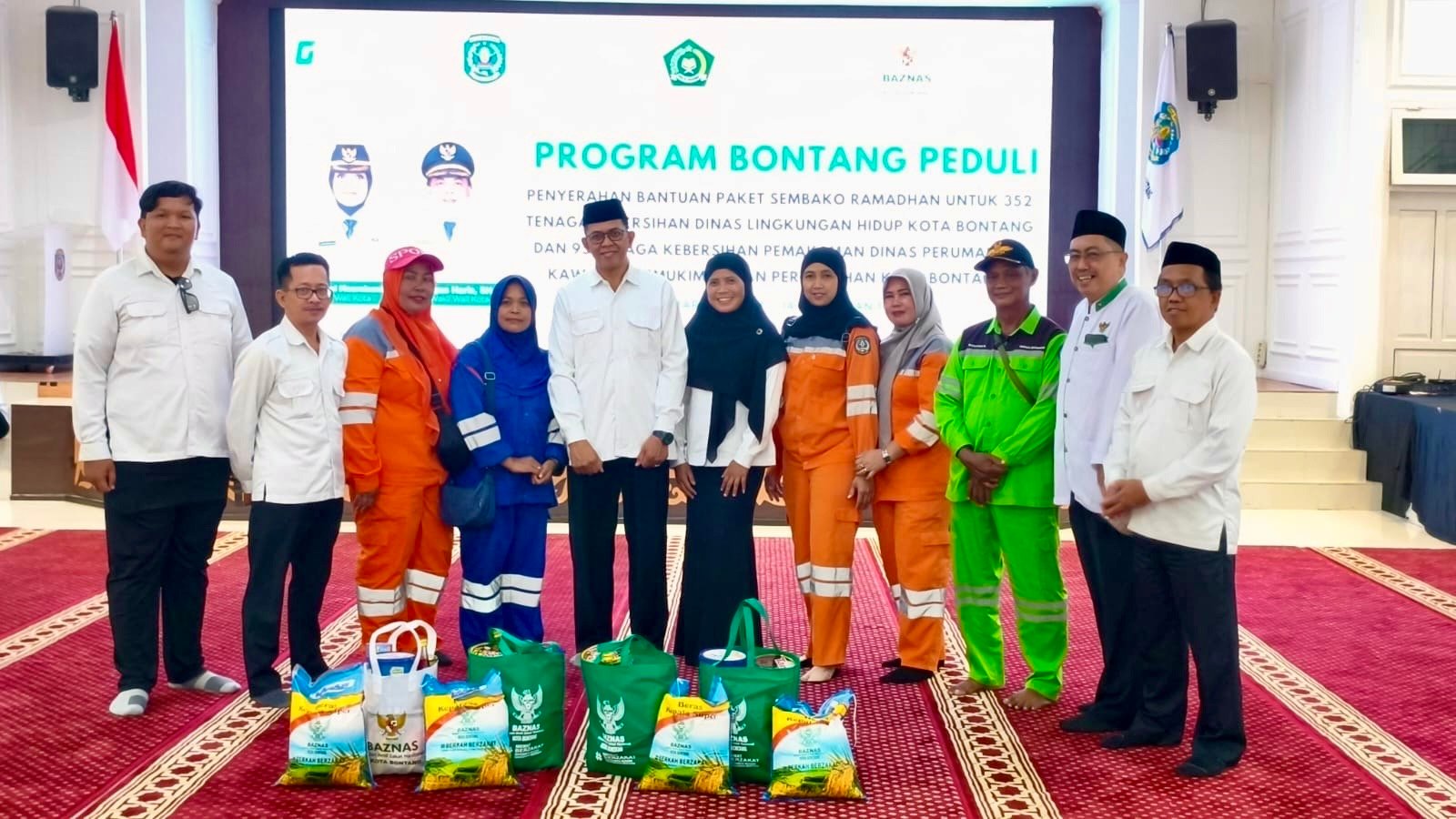 Teks: Penyerahan bantuan paket sembako oleh Baznas bersama Pemkot Bontang terhadap 447 tenaga kebersihan di Kota Bontang, Rabu, 4/3/2026. (Infosatu.co/Adi)
