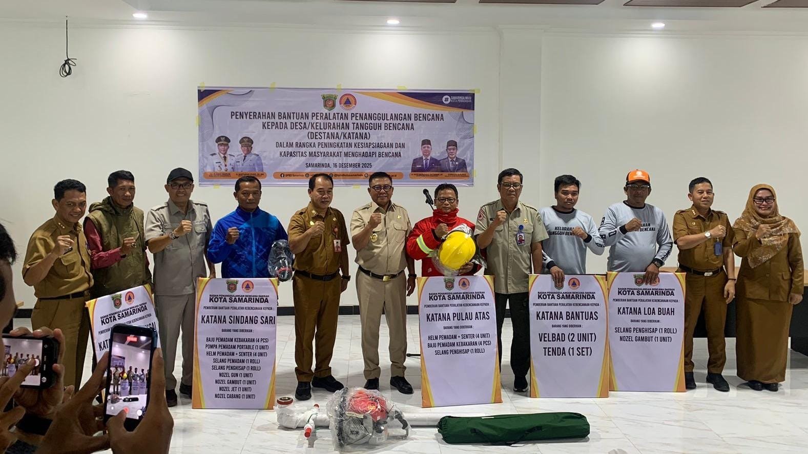 Teks: Penyerahan Bantuan Peralatan penanggulangan Bencana Kepada Desa/Kelurahan Tangguh Bencana oleh BPBD Kota Samarinda