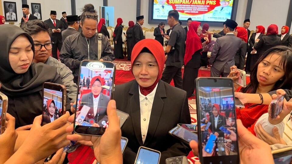 Teks: Sekretaris Kota Samarinda, Neneng Chamilia Santi saat diwawancarai awak media usai dilantik di Aula Rujab Wali kota Samarrinda Kamis, 2 April 2026. (Emmi/infosatu.co)