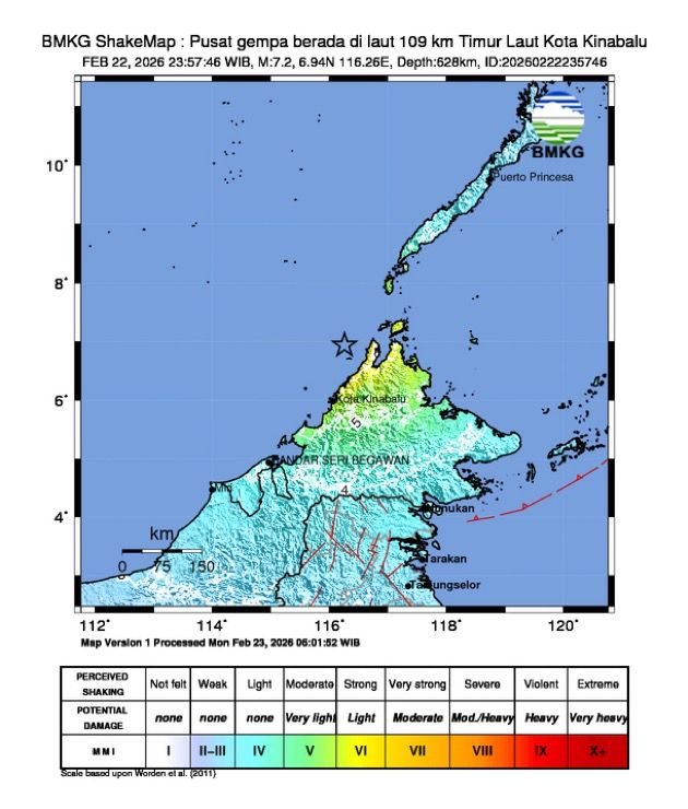 Jakarta, Infosatu.co — Gempa bumi dengan kekuatan magnitudo 7,2 mengguncang wilayah Kota Kinabalu pada Minggu 22 Februari 2026 malam sekitar pukul 23.57 WIB.