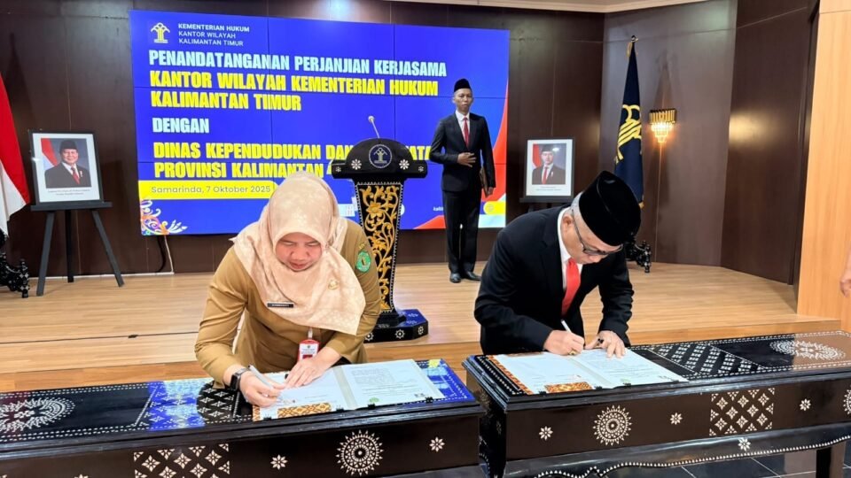 Penandatanganan Perjanjian Kerja Sama (PKS) dilakukan di aula Kanwil, Selasa, 7 Oktober 2025, oleh Kepala Kanwil Kemenkum Kaltim, Muhammad Ikmal Idrus, dan Kepala Dinas Dukcapil Kasmawati, disaksikan sejumlah pejabat kedua instansi.