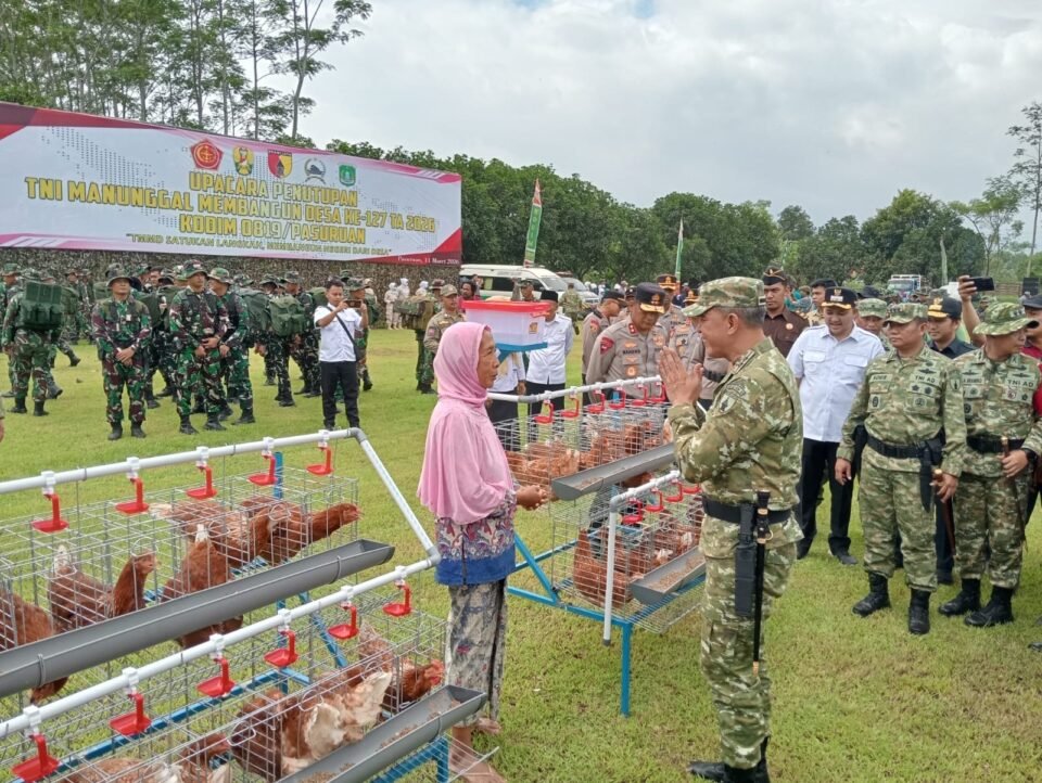 Pasuruan, infosatu.co — Panglima Kodam V/Brawijaya, Rudy Saladin, menyerahkan bantuan ayam petelur lengkap dengan kandangnya kepada warga saat penutupan program TNI Manunggal Membangun Desa (TMMD) ke-127 di Lapangan Desa Wonosari, Kecamatan Gondangwetan, Kabupaten Pasuruan, Jawa Timur.