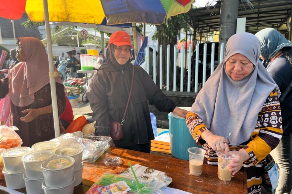 “Ayo mampir minum dulu. Ini gratis, ya. Jangan lupa panggil teman-temannya untuk mampir minum di sini,” seru teman dari Age, si pemilik lapak UMKM yang terlihat ramah.