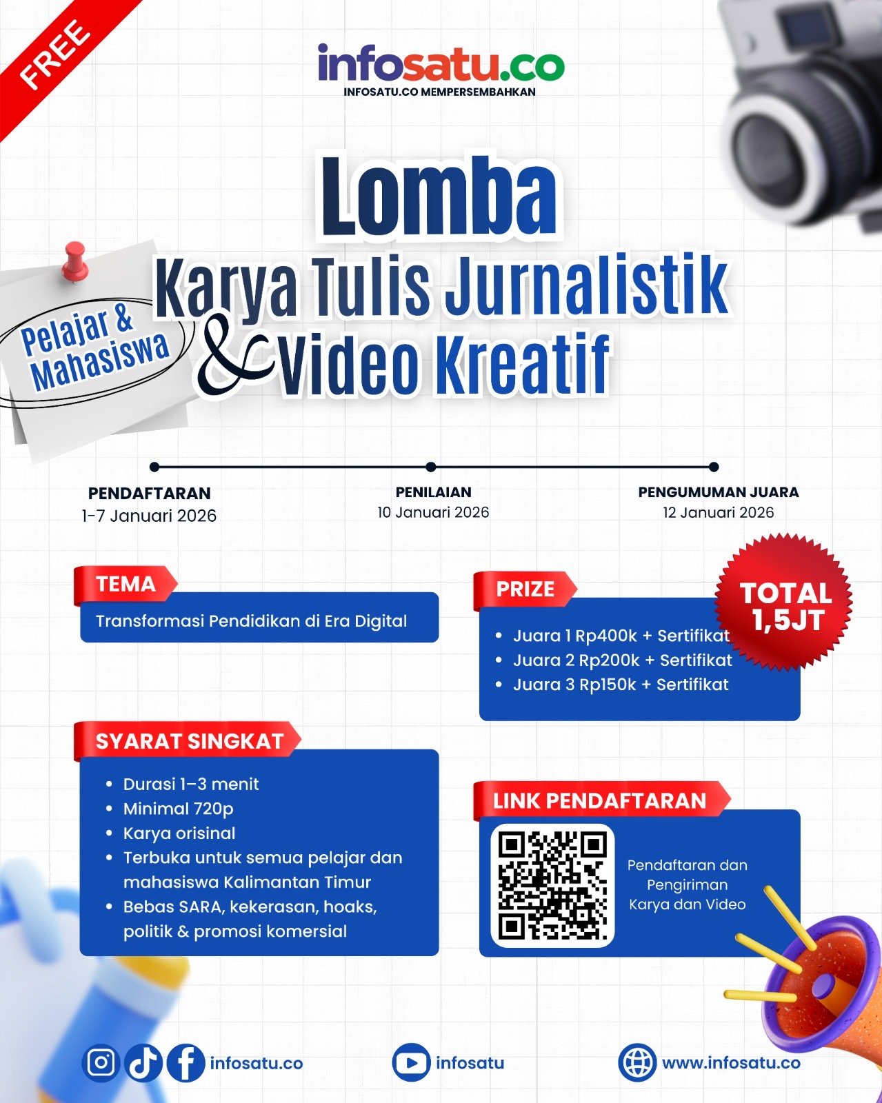 Samarinda, infosatu.co – Media Online Infosatu.co resmi menyelenggarakan “Lomba Tulis Jurnalistik dan Video Kreatif” sebuah kompetisi dalam memulai awal tahun 2026 bagi generasi muda di Kalimantan Timur (Kaltim).