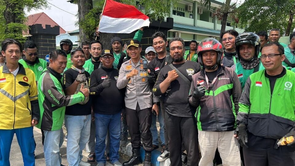 Di sela-sela aksi, Kapolres Pasuruan Kota bersama anggota membagikan air minum dan makanan ringan, sebagai bentuk empati bagi para abang Ojol yang memperjuangkan haknya.