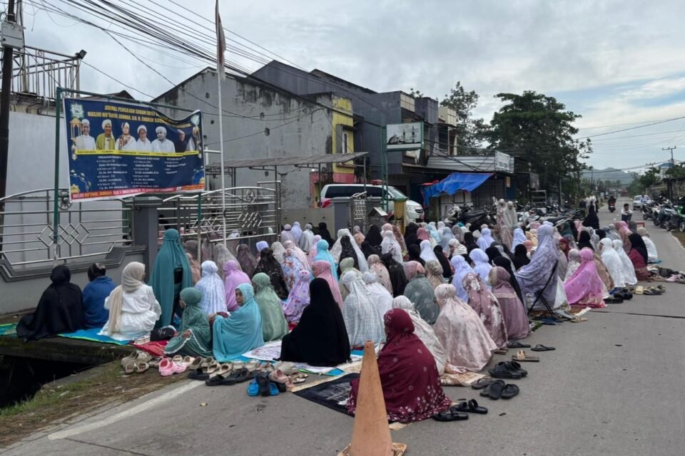 Teks: Kepadatan jemaah membuat sebagian warga melaksanakan salat hingga ke badan jalan (Infosatu.co/Firda)