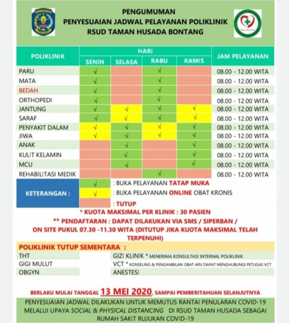 Bontang, infosatu.co – RSUD Taman Husada kembali mengubah jadwal pelayanan poliklinik pada Rabu, (13/5/2020) dan mengumumkannya melalui media sosial Instagram @rsudbontang.