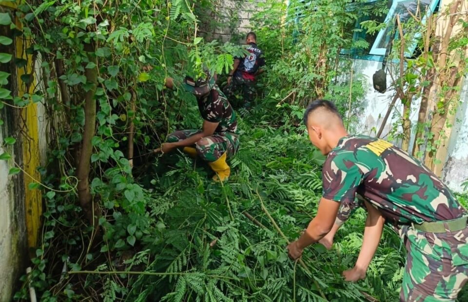 Dengan penuh semangat kebersamaan, personel Satgas TMMD bahu-membahu membersihkan sampah, memangkas rumput liar, serta merapikan area sekitar sekolah agar tampak lebih bersih, rapi, dan sehat.