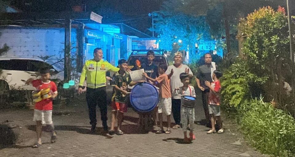 Suasana penuh keakraban terlihat ketika Aipda Arifian bersama pemuda dan anak-anak setempat berkeliling lingkungan perumahan untuk membangunkan warga.