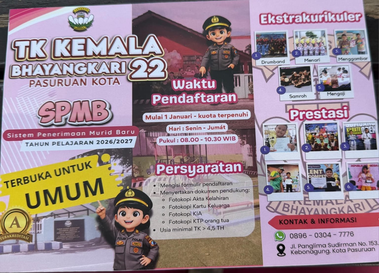 Kegiatan ini menjadi bagian dari sosialisasi Sistem Penerimaan Murid Baru (SPMB) Tahun Ajaran 2026/2027 TK Kemala Bhayangkari 22 yang beralamat di Jalan Panglima Sudirman 153, Asrama Polisi (Aspol) Kebonagung, Kota Pasuruan.