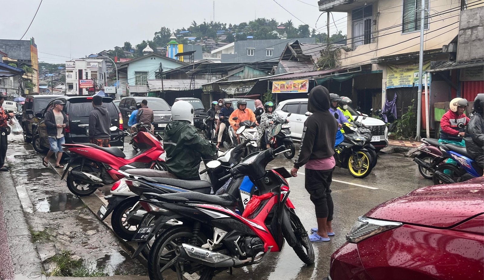 Kendaraan roda dua dan roda empat tampak berderet memenuhi sisi jalan.