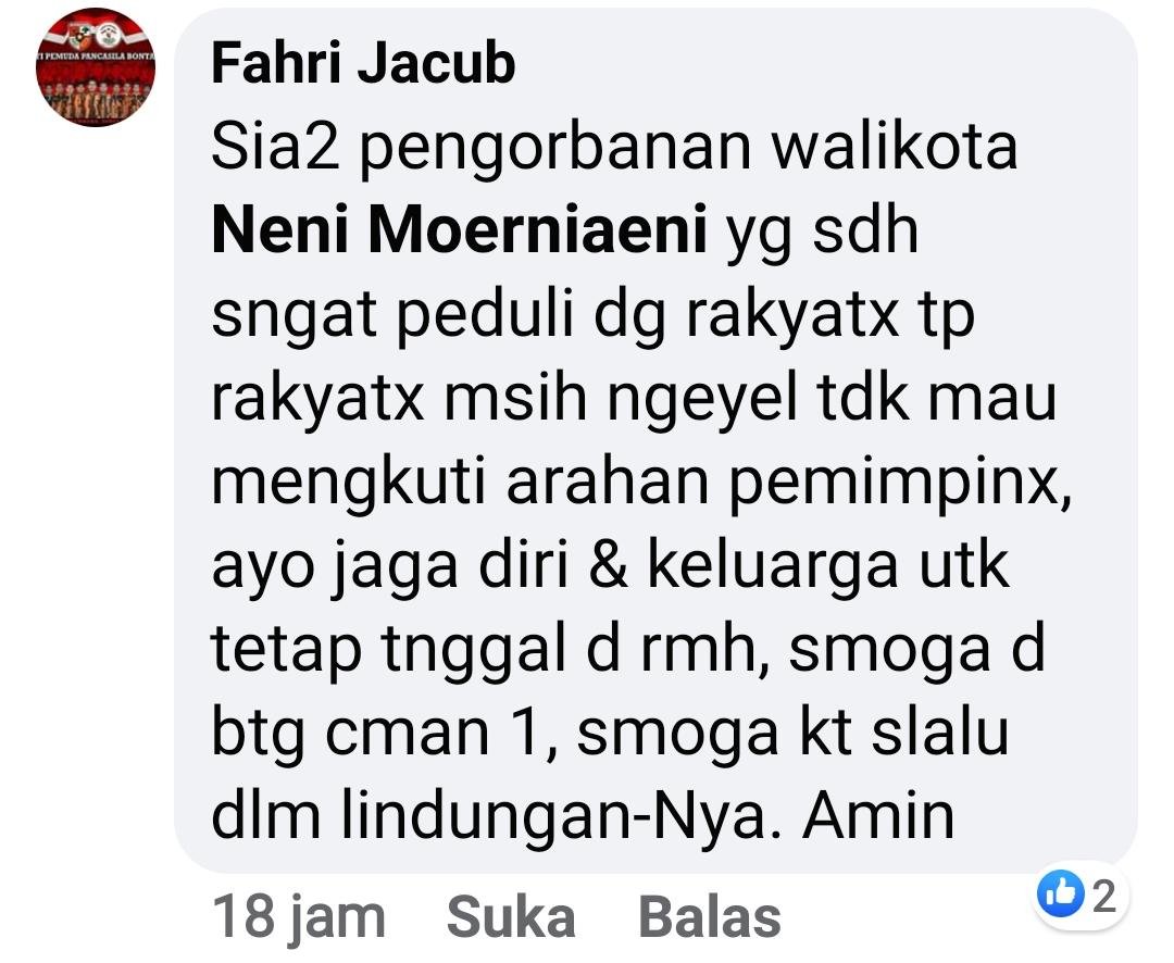 “Sia-sia pengorbanan Walikota Bontang Neni Moerniaeni yang sudah sangat peduli dengan rakyatnya. Tapi rakyatnya masih ngeyel tidak mau mengikuti arahan pimpinannya. Ayo jaga diri dan keluarga untuk tetap tinggal dirumah,” ujar Fahri Jacub.