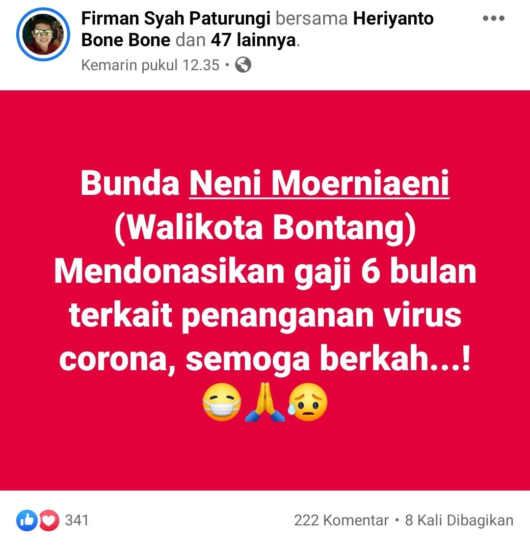 Melalui media sosial Facebook salah satu warga bernama Firman Syah Paturungi, Minggu (29/3/2020), terlihat keputusan Walikota Bontang itu dinilai tepat. Hal tersebut terlihat sebanyak 222 komentar membanjiri postingan tersebut. Masyarakat turut senang dan banyak mendoakan Neni Moerniaeni.