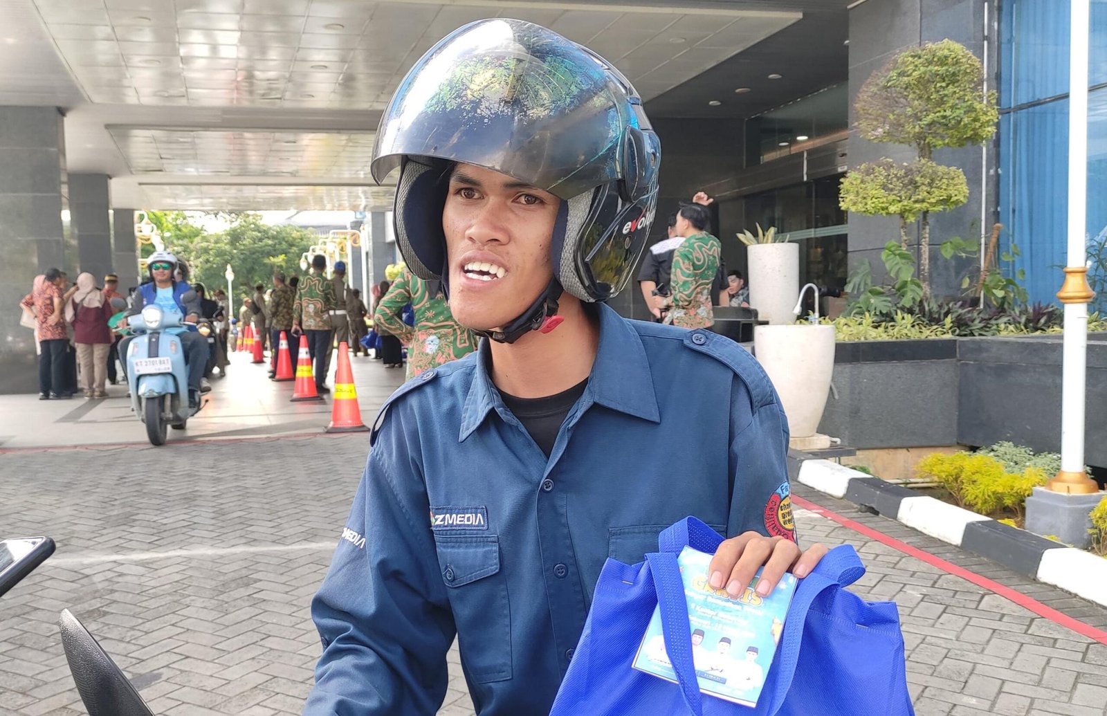 Teks: Pekerja di Faznet, Ihsan usai menerima takjil (Infosatu.co/Andika)